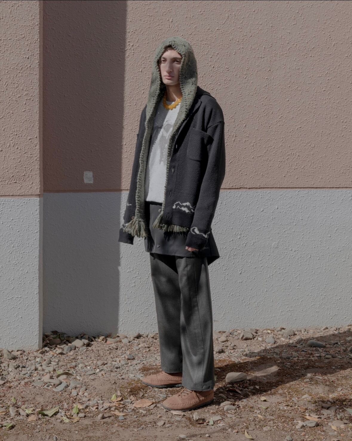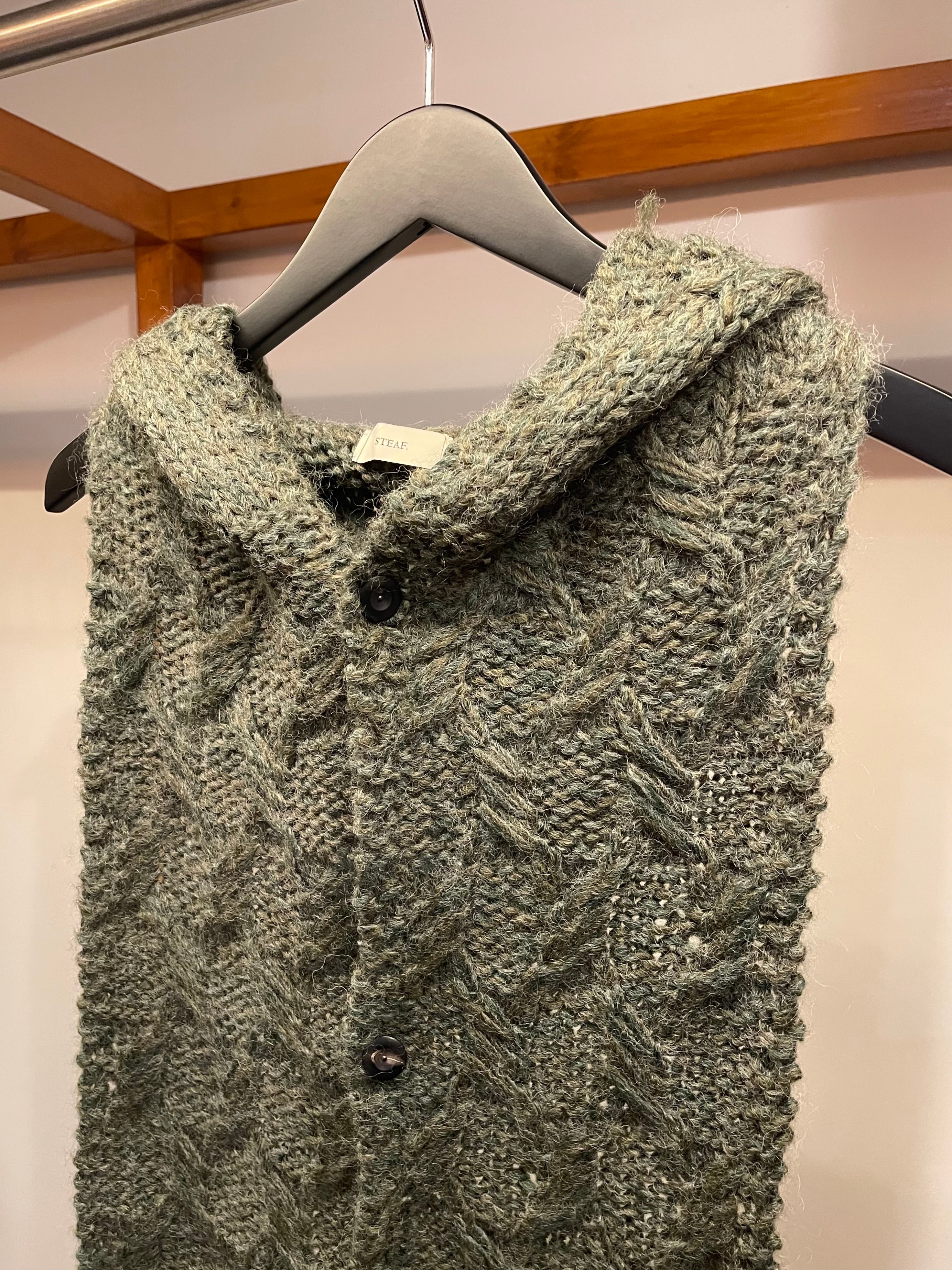 オールハンドメイドのフード付きマフラー。