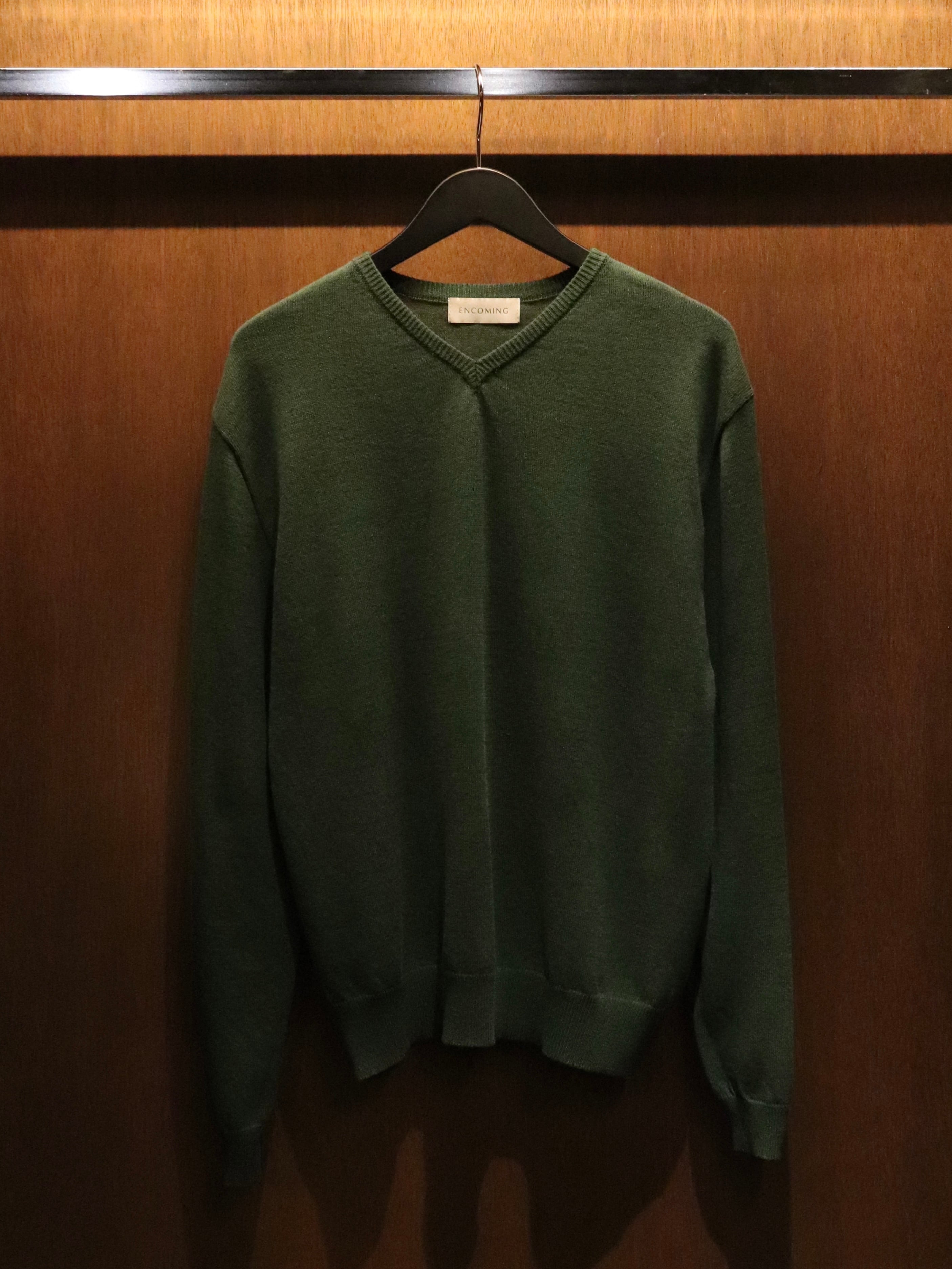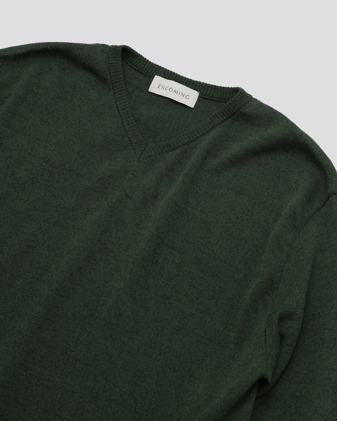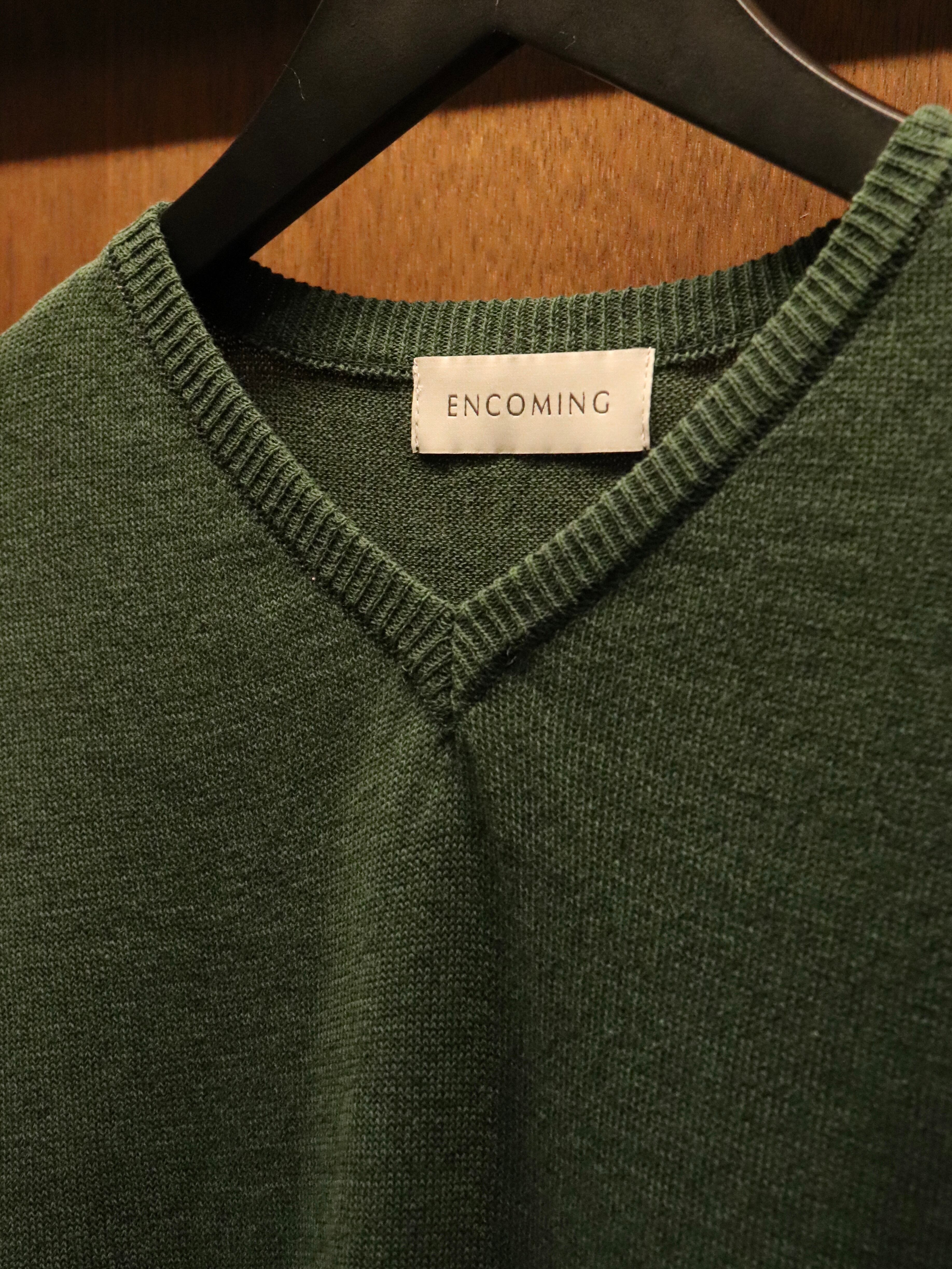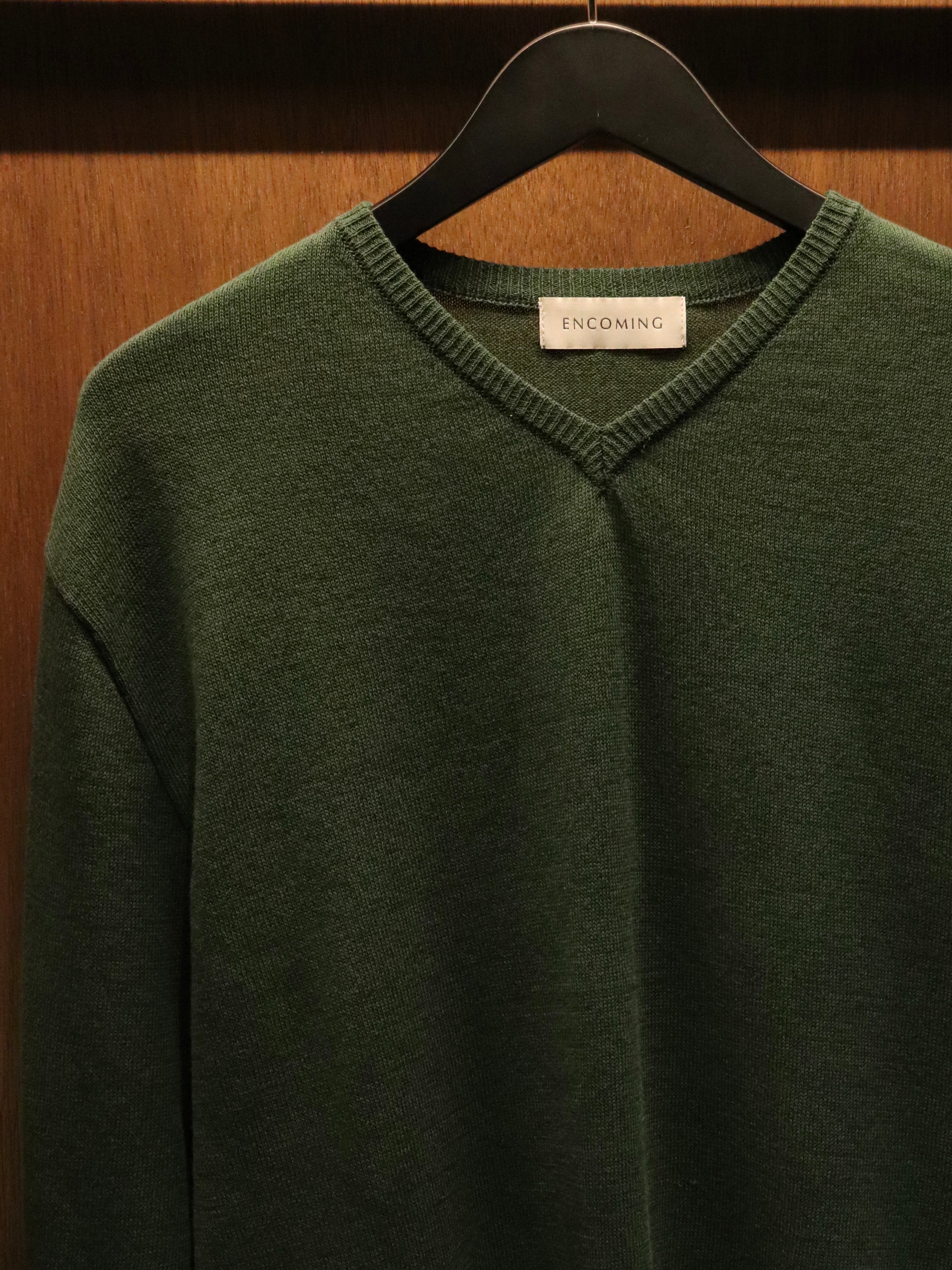 ENCOMINGとして新しく提案するサマーニットカットソーシリーズ。コットン糸をベースに清涼感のある和紙の糸を撚糸し、先染めをしたオリジナル生地。浅めのVネックはダブルになっており、ヨレにくい仕様になっている。コットンの糸と和紙の糸を微妙に染め分けることで、奥行きのあるメランジ調になっている。