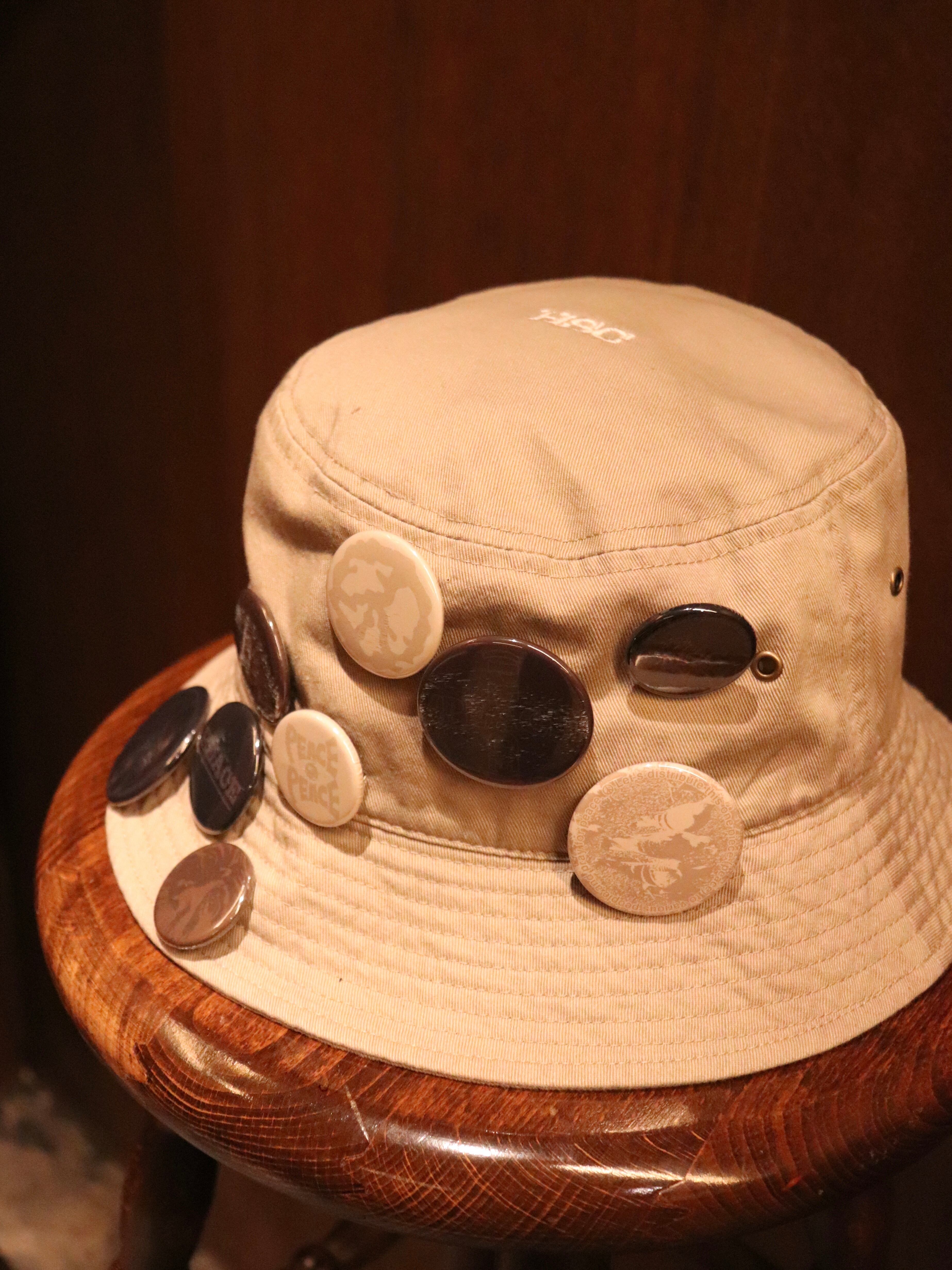 缶バッジを配置するとカモ柄のような配色になるデザイン。